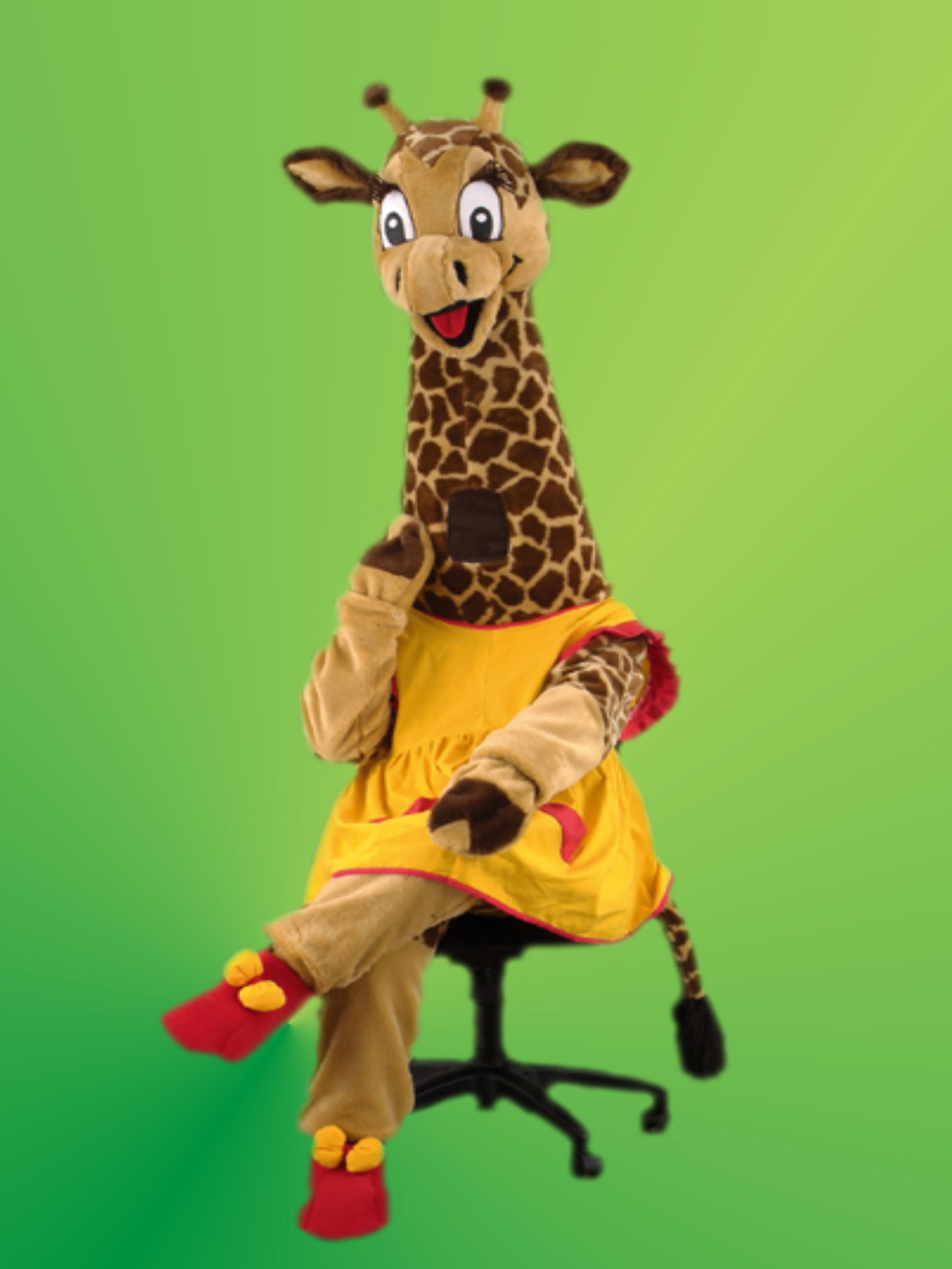 Важная дама в элегантном платье и с длинной шеей - это наша Жирафа, которая хоть и глядит на всех сверху вниз, но на самом деле очень добродушна и любит повеселиться! Где она только не побывала: на спортивных матчах и на детских праздниках, на новогодних утренниках и на встрече делегации в аэропорту! Мы предлагаем взять костюм ростовой куклы Жирафа на ваше мероприятие и пусть наша дамочка покажет себя во всей красе.